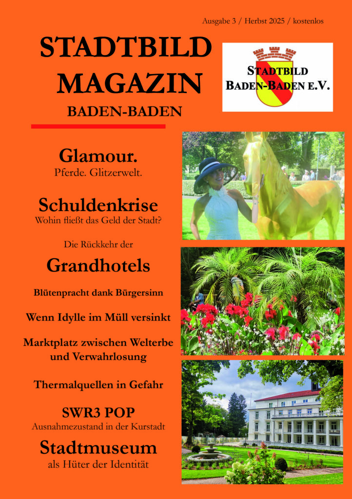 Das Stadtbild Magazin erscheint vierteljährlich und widmet sich den Themen, die unsere Stadt bewegen: Stadtbildpflege, Bürgerbeteiligung und aktuelle Entwicklungen in Baden-Baden. Wir möchten – unabhängig, sachlich und inspirierend – zeigen, was unsere Stadt lebendig macht, was sie herausfordert und was uns alle verbindet.