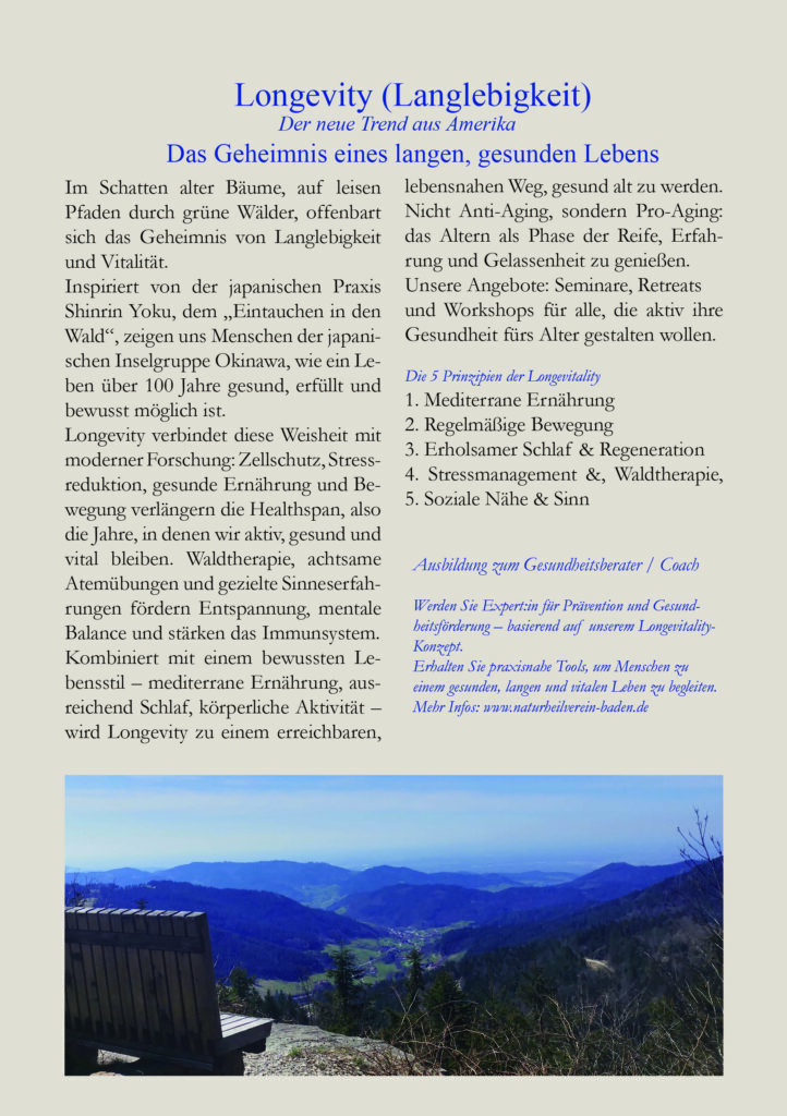 Weitere Infos über Longevity- Langlebigkeit finden Sie unter: https://naturheilverein-baden.de/gesundheit-natur-und-lebensqualitaet-im-alter/