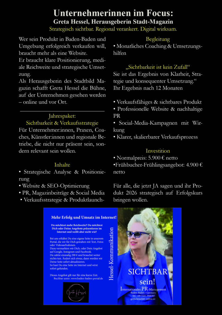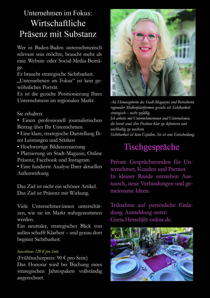 Ob als Gastronom, Kulturschaffender oder Unternehmen: Sie profitieren von unserer starken Sichtbarkeit und redaktionellen Qualität – im Netz und im echten Leben Mit über 25.000 Suchimpressionen, Top-Google-Rankings und organischem Wachstum ist das Baden-Baden-Portal eine starke Plattform für Ihre Gastronomie – lokal, authentisch und nachhaltig