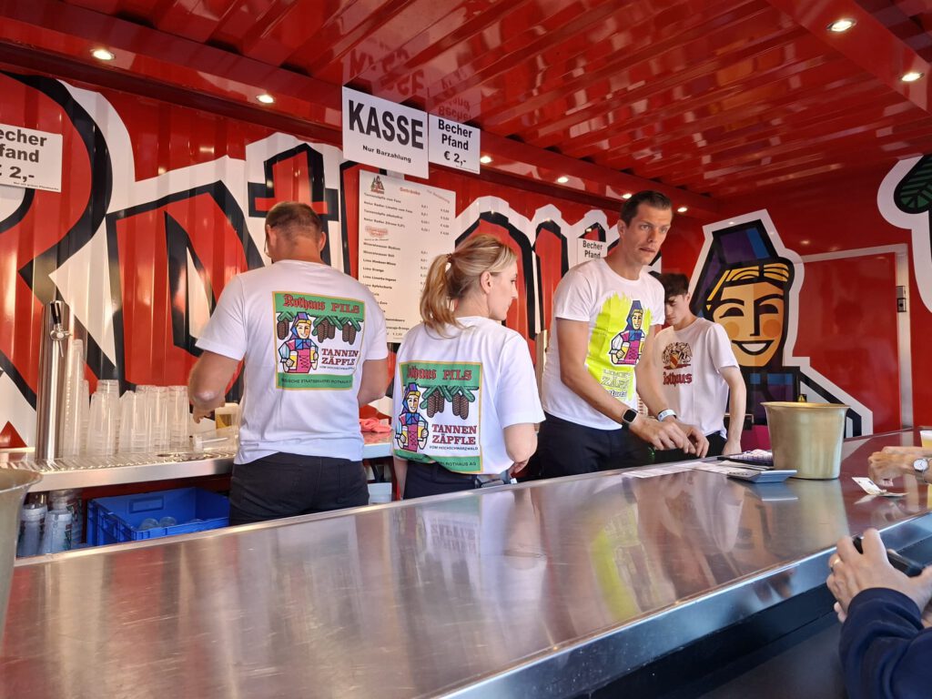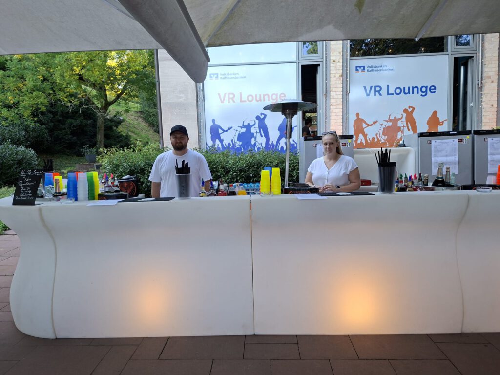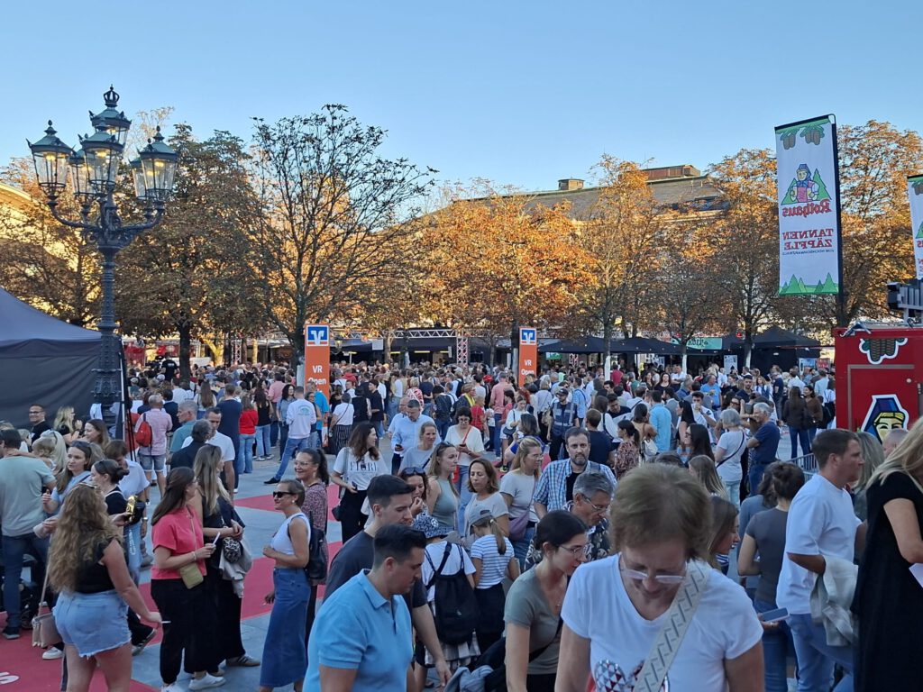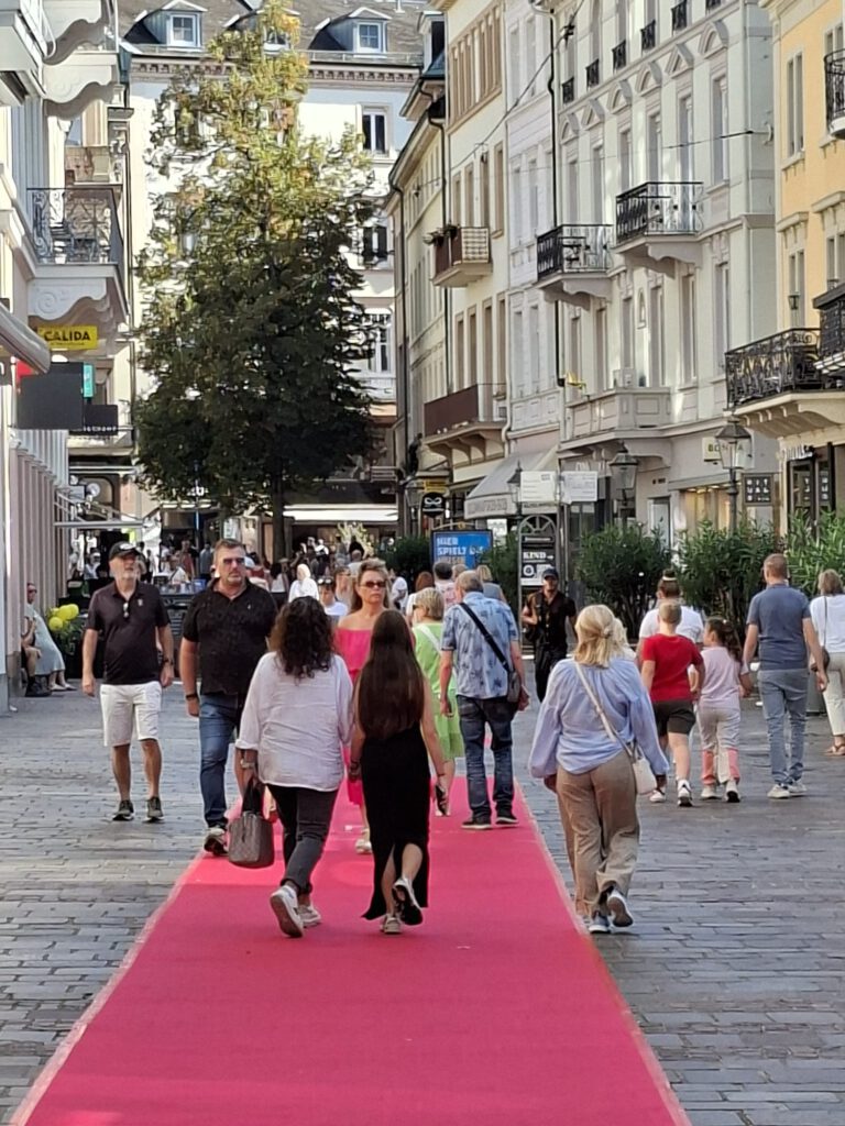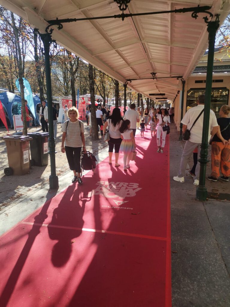 Pressekonferenz am Selfiestand, der steht mitten in den Kollonaden neben Cafe Rubin. Hier könnt Ihr Selfies mit den Promis machen.